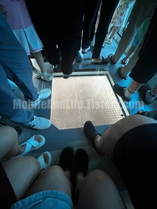 25명이 탑승하게 되는데 사진에서 보시는 것처럼 케이블카 내부에 여유가 별로 없습니다. 좁은 장소를 싫어하시는 분들은 타기 어렵겠다는 생각이 들었습니다. 중앙 바닥이 투명하게 되어있어서 바다를 볼 수 있게 되어 있습니다. 앉을 공간이 케이블카 앞뒤로 두 군데 있습니다. 한쪽에 4명씩 총 8명은 앉아 갈 수 있을 정도입니다.