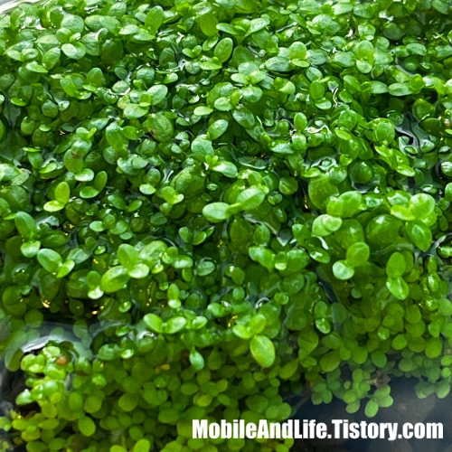 일주일이 더 지난 사진입니다. 매우 풍성해졌습니다. 물속에 지저분한 부유물질들이 생겨서 중간에 물에 담갔던 것을 다시 밖으로 꺼냈습니다. 전체적인 군집의 크기도 커졌으며 파인 곳 없이 풍성하게 잘 자라주고 있습니다.
