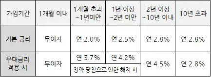 | 가입기간 | 기본 금리 | 우대 금리 | 청년 우대형합산 이자율 |