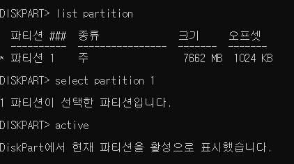 다시 파티션목록을 확인하여 1번 파티션을 선택(select partition 1)한 후 active 명령어를 실행하여 파티션을 활성화합니다.