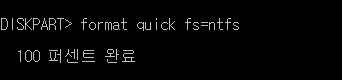 format quick fs=ntfs의 명령어를 입력하여 usb를 포맷합니다.